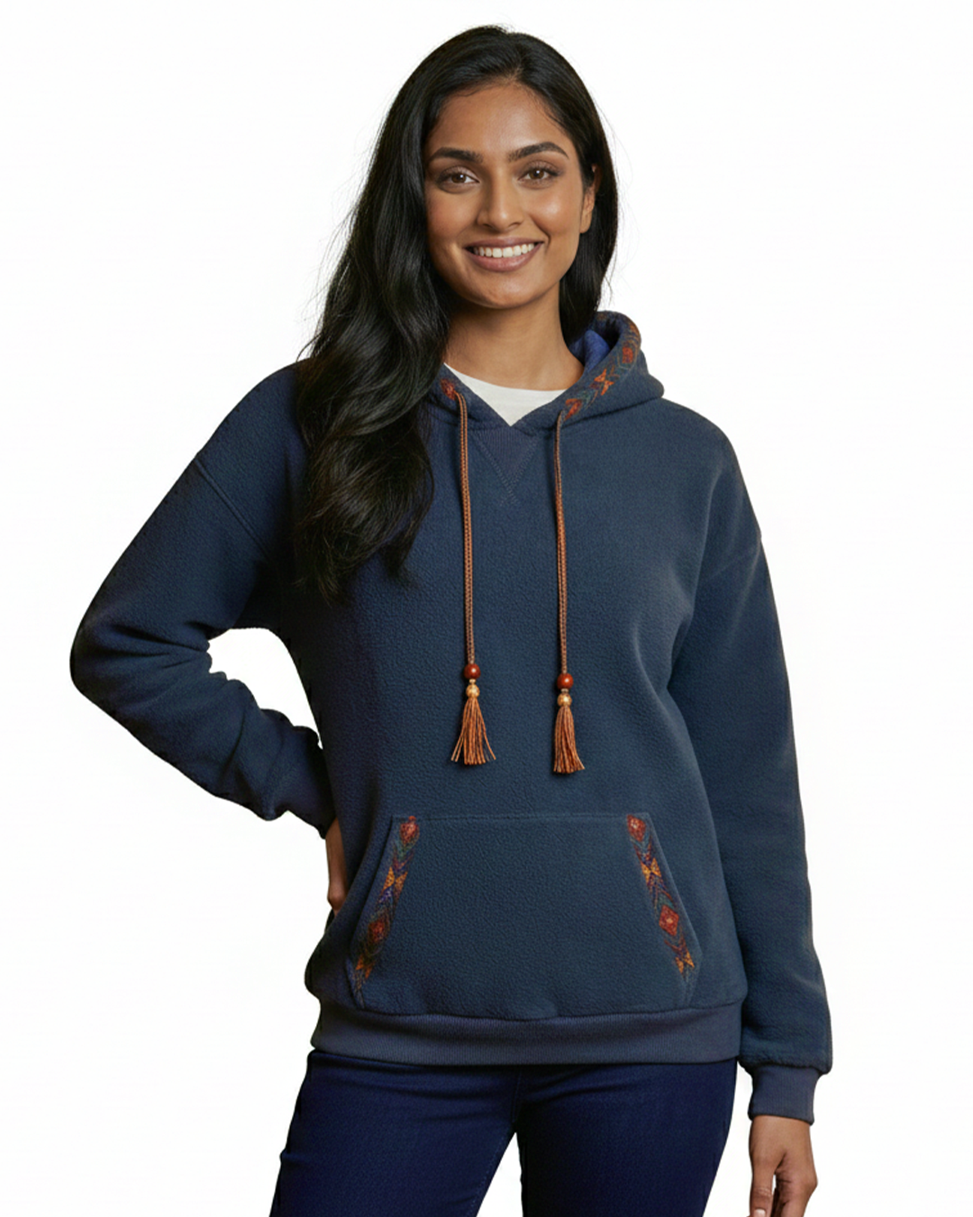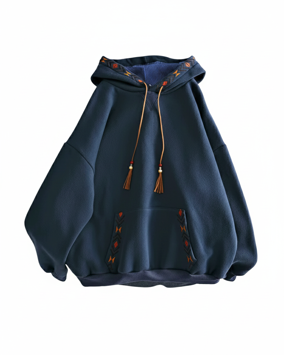 Add a pop of color and style to your wardrobe with this chic blue hoodie, featuring stunning geometric embroidery. Made from high-quality, breathable fabric, this hoodie offers both comfort and durability. The drawstring hood is embellished with eye-catching tassels and beads, adding a playful touch. The intricate embroidery on the front pocket and hood sets this hoodie apart, making it perfect for those who love unique and fashionable pieces. Ideal for casual outings, this hoodie ensures you stay stylish and comfortable all day long.