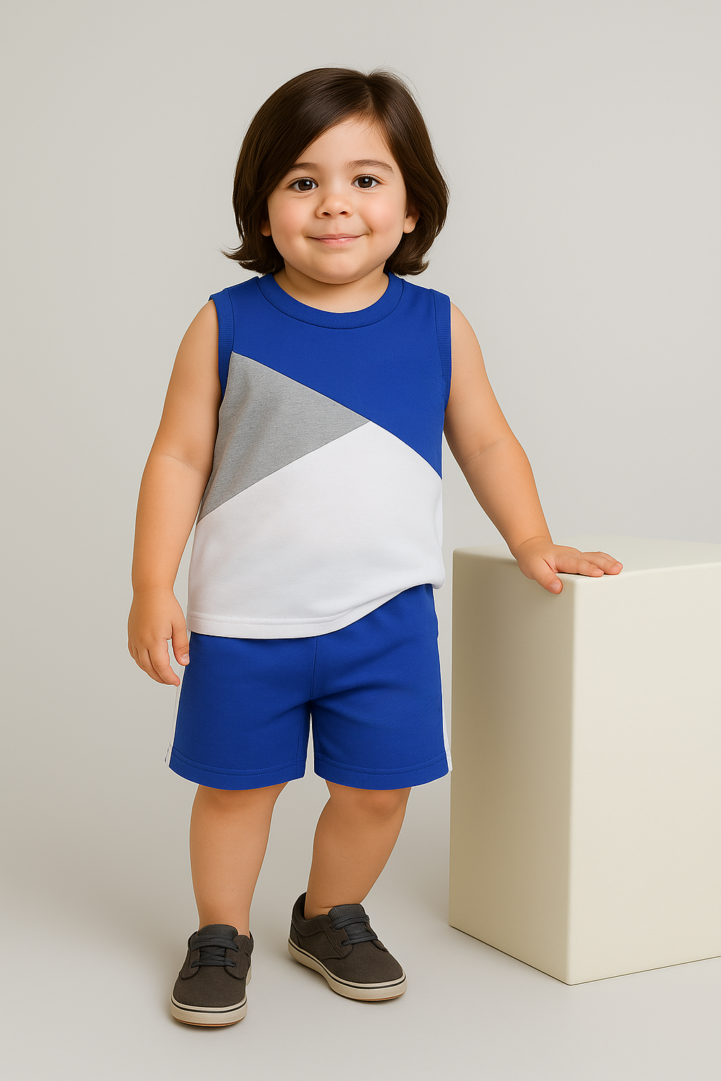 Keep your little champ cool and stylish this summer with our Cool Comet Sleeveless Shorts Set! Featuring a trendy color-blocked tank top with a bold royal blue, grey, and white panel design, paired with matching royal blue shorts — this outfit is perfect for playtime or casual outings.
