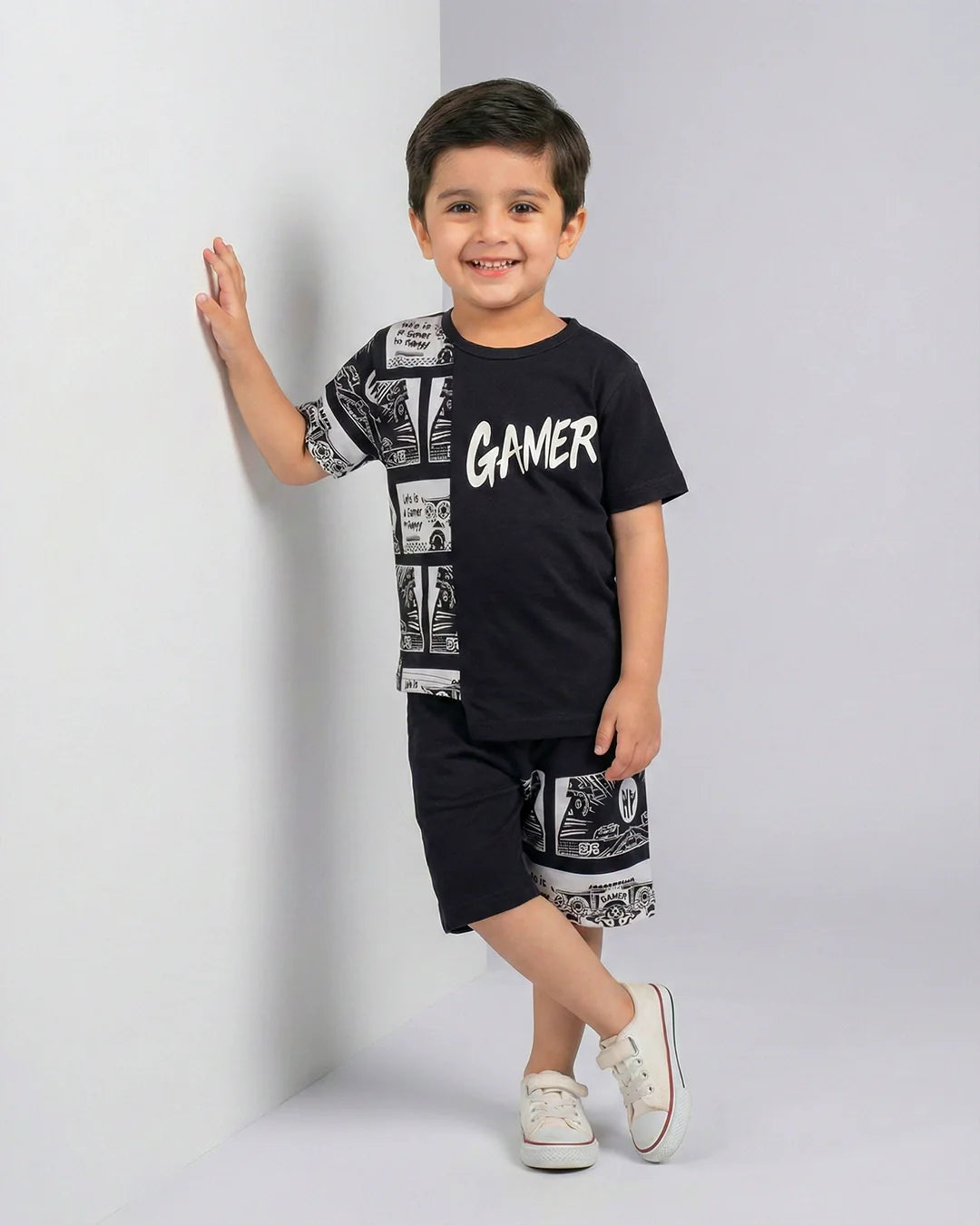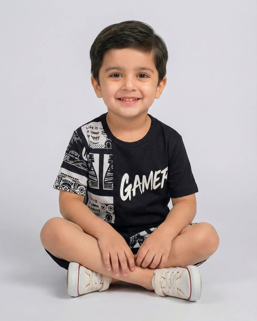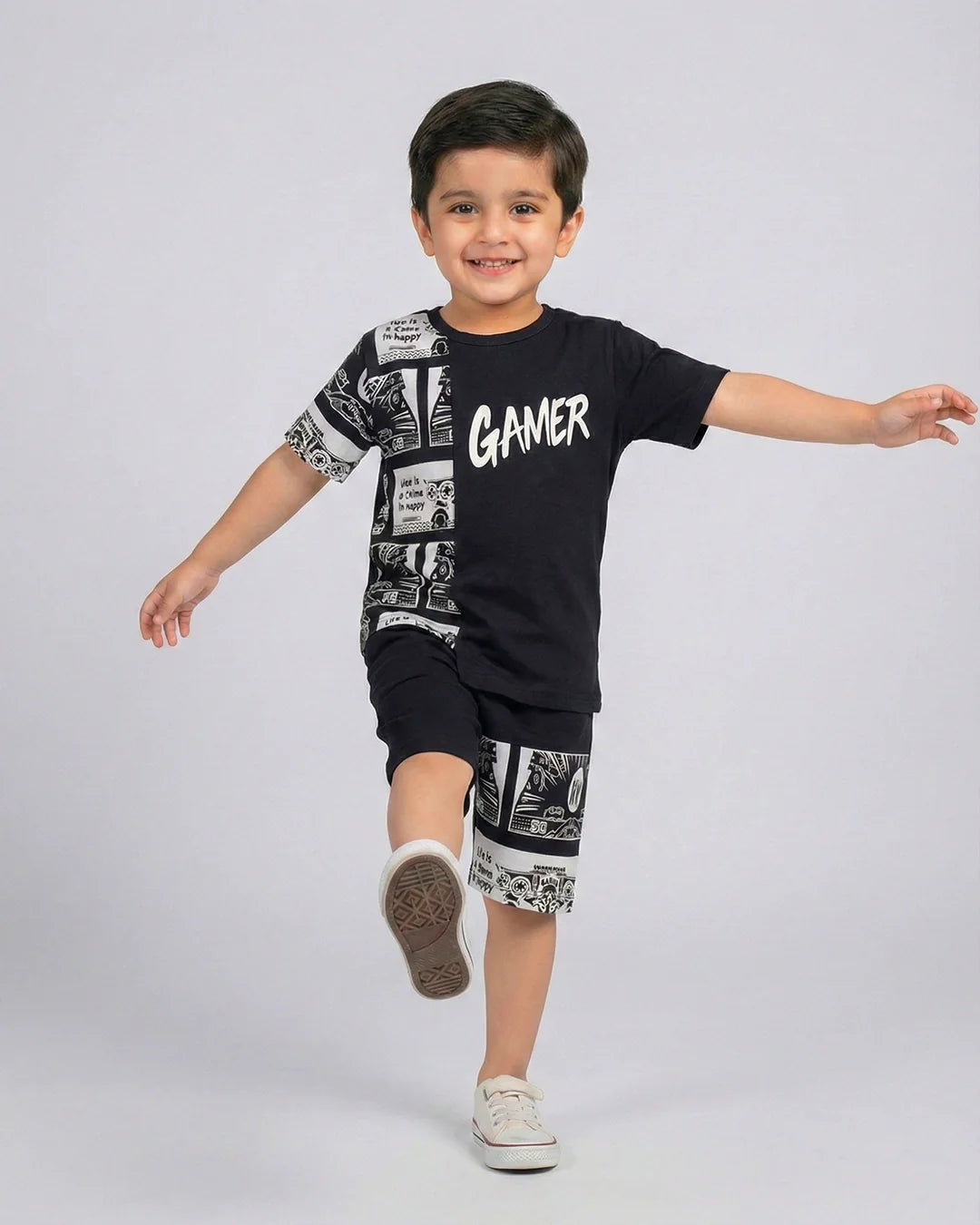 The modern graphic design adds a fun gamer-inspired vibe, making it a perfect outfit for kids who love games, creativity, and active days. Whether it’s playtime, casual wear, or summer outings, this set keeps your child looking stylish and feeling comfortable all day long.