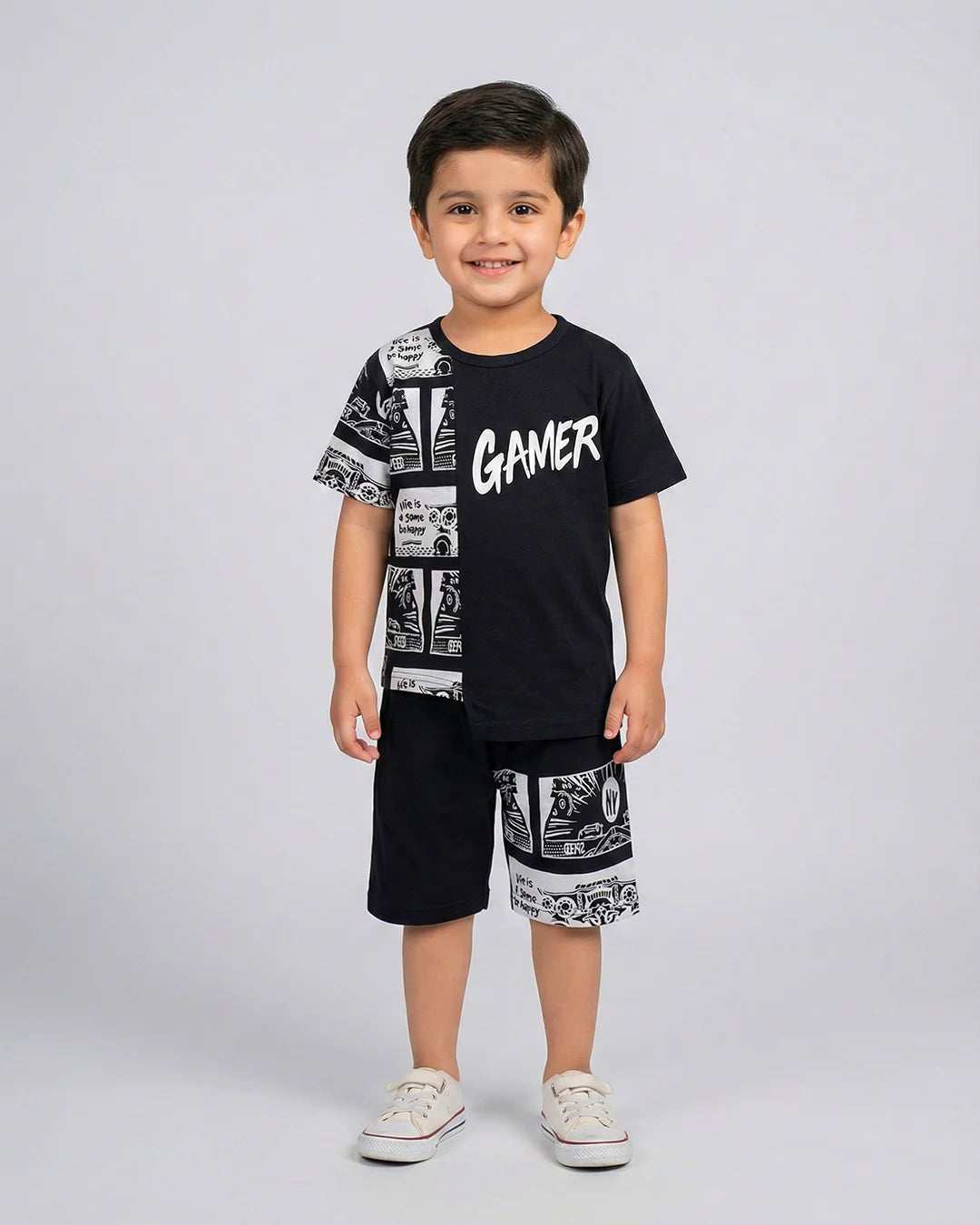 Let your little one step into playtime with style in the Game On Kids Short Set. This trendy two-piece outfit features a cool black t-shirt with a bold “Gamer” graphic and unique contrast comic-style panels, paired with matching comfortable shorts. Designed for both style and comfort, the soft and breathable fabric keeps kids relaxed during play, outings, or everyday adventures.