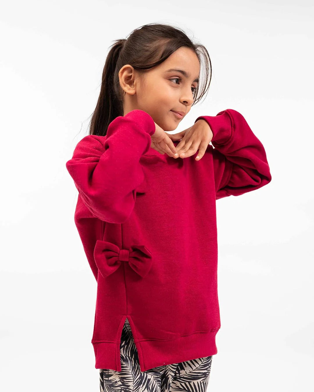Our Girls Bow Sweatshirt & Leaf Print Jogger Set is designed to keep your little one warm and stylish this winter. Made from premium cotton fleece, this adorable two-piece outfit features a bow-detailed sweatshirt paired with tropical leaf print jogger pants — a perfect blend of comfort and fashion.
