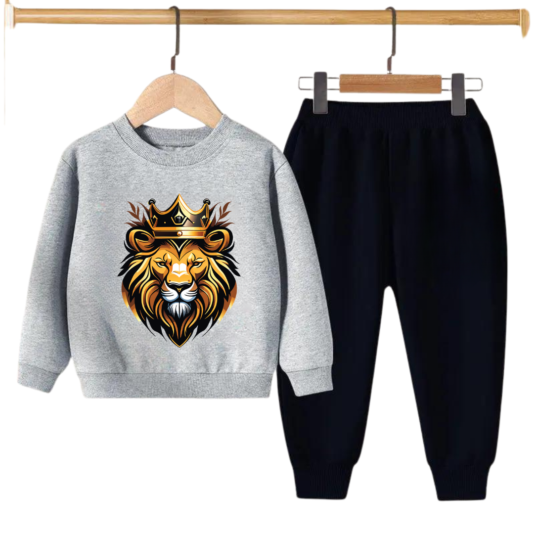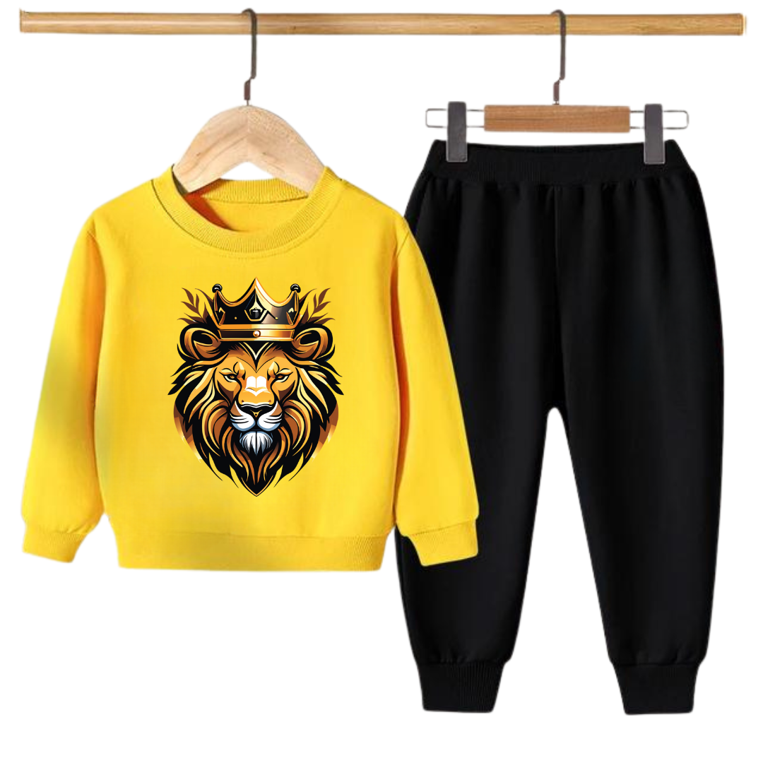 This Kids Sweatshirt & Pant is perfect for your little one's winter wardrobe! Crafted from breathable knitted Fleece Fabric, this two-piece set features a "GOLDEN KING" print on the front of the sweatshirt, and the trousers feature a print on the left leg. Soft and stretchy, this outfit is perfect for everyday wear, keeping your little one warm and comfortable all winter long.