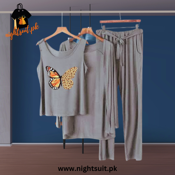 Grey Orange Butterfly Women Night Suit PJ 3 Pieces Set