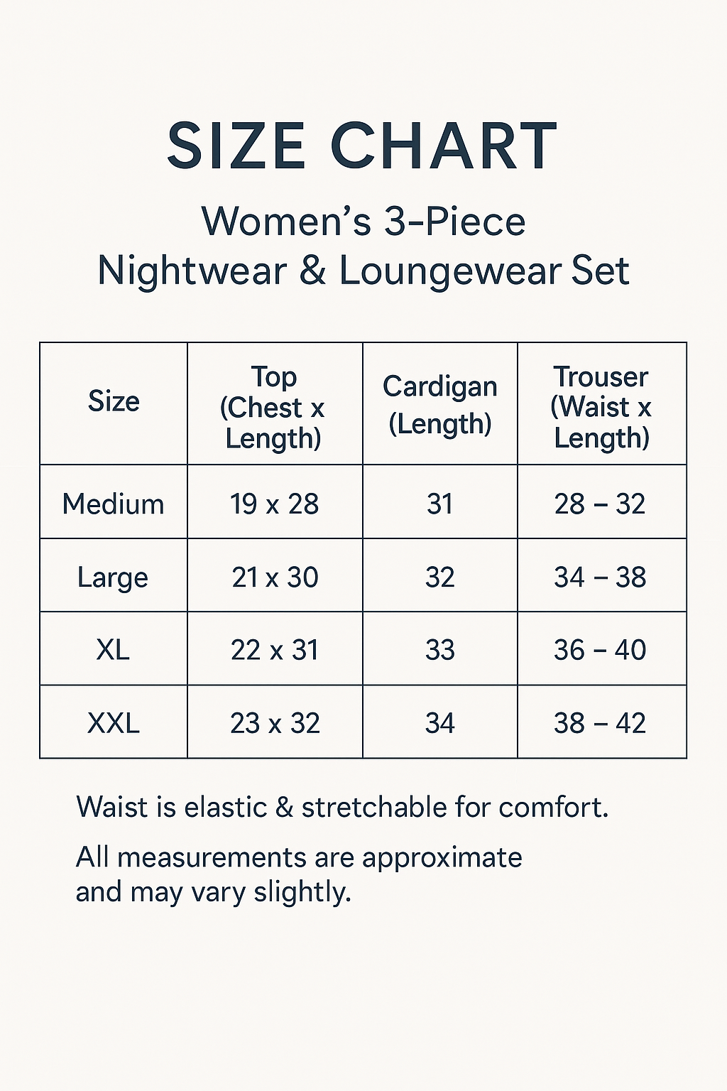 Upgrade your nightwear collection with our Women’s 3 Piece Nightwear Lounge Set – the perfect blend of comfort, style, and elegance. Designed with soft, breathable fabric, this set is ideal for relaxing at home, cozy nights, or stylish loungewear.